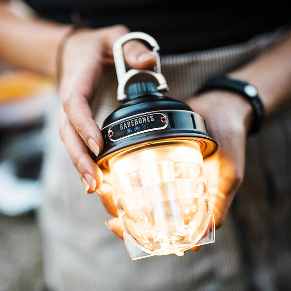 Our Barebones Beacon light comes with a smooth dimming feature that allows you to completely brighten your surroundings or simply set the mood. This portable light easily hangs with its carabiner top or stands on its sturdy base. The Beacon comes with a 30-inch cord for its rechargeable battery—which lasts 200+ hours on low or three hours on high. And thanks to a convenient battery life indicator, you’ll never be left in the dark.