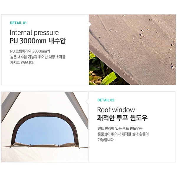 - Component : Body, Inner tent, Roof, Ground sheet, Triangular pocket, Daisy chain, Main pole 2EA, Front·Rear pole 2EA, Center pole, Inner pole, Canopy pole 2EA, Steel peg 22EA, String 8EA, Carry bag